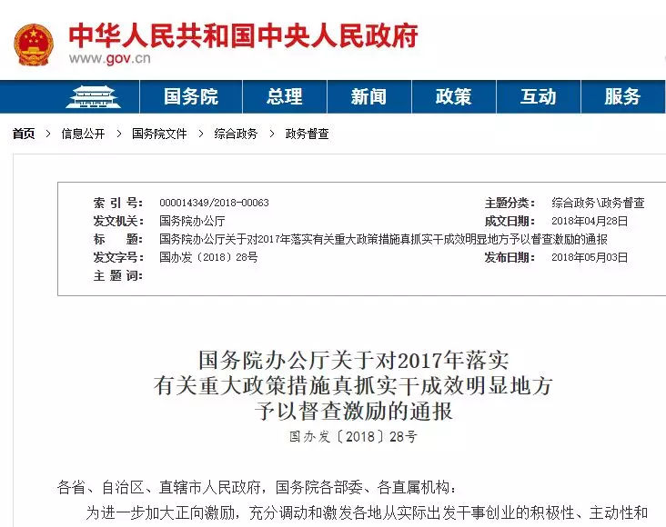近期,国办发〔2018〕28号文下发,对2017年落实有关重大政策措施真抓实干成效明显地方予以督查激励。